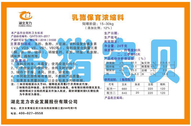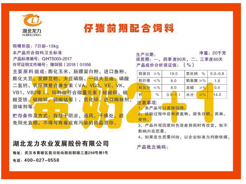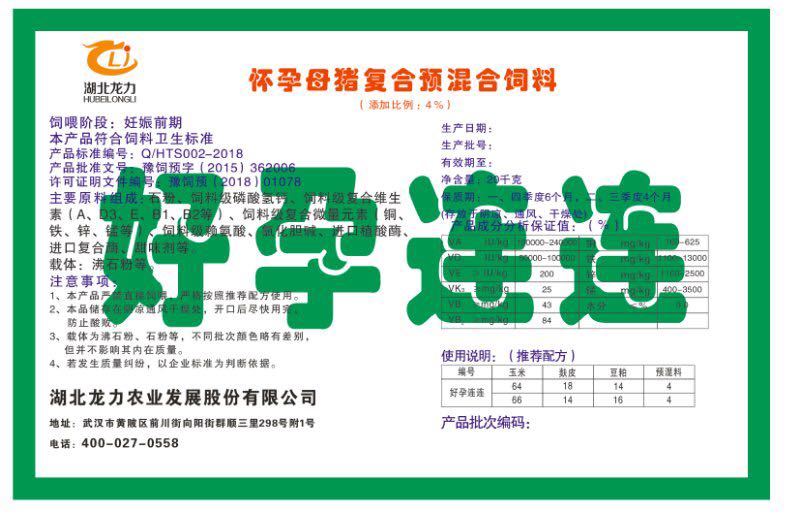 湖北龍力農業發展股份有限公司坐落于武漢市黃陂區前川街向陽街群順三里298號附1號。公司成立于2014年6月,公司自成立以來把“創全球最大養豬綜合服務”為企業愿景。致力于打造教保料品牌”作為公司發展的明確目標。公司一直致力于豬營養的研究和開發,積極與國內外高校和科研機構合作,推廣養豬技術、動物營養新概念,向世界農牧企業學習與合作。公司采用國內先進的生產工藝,選擇高精度電子配料秤,高均勻度、無殘留混合機等先進設備....